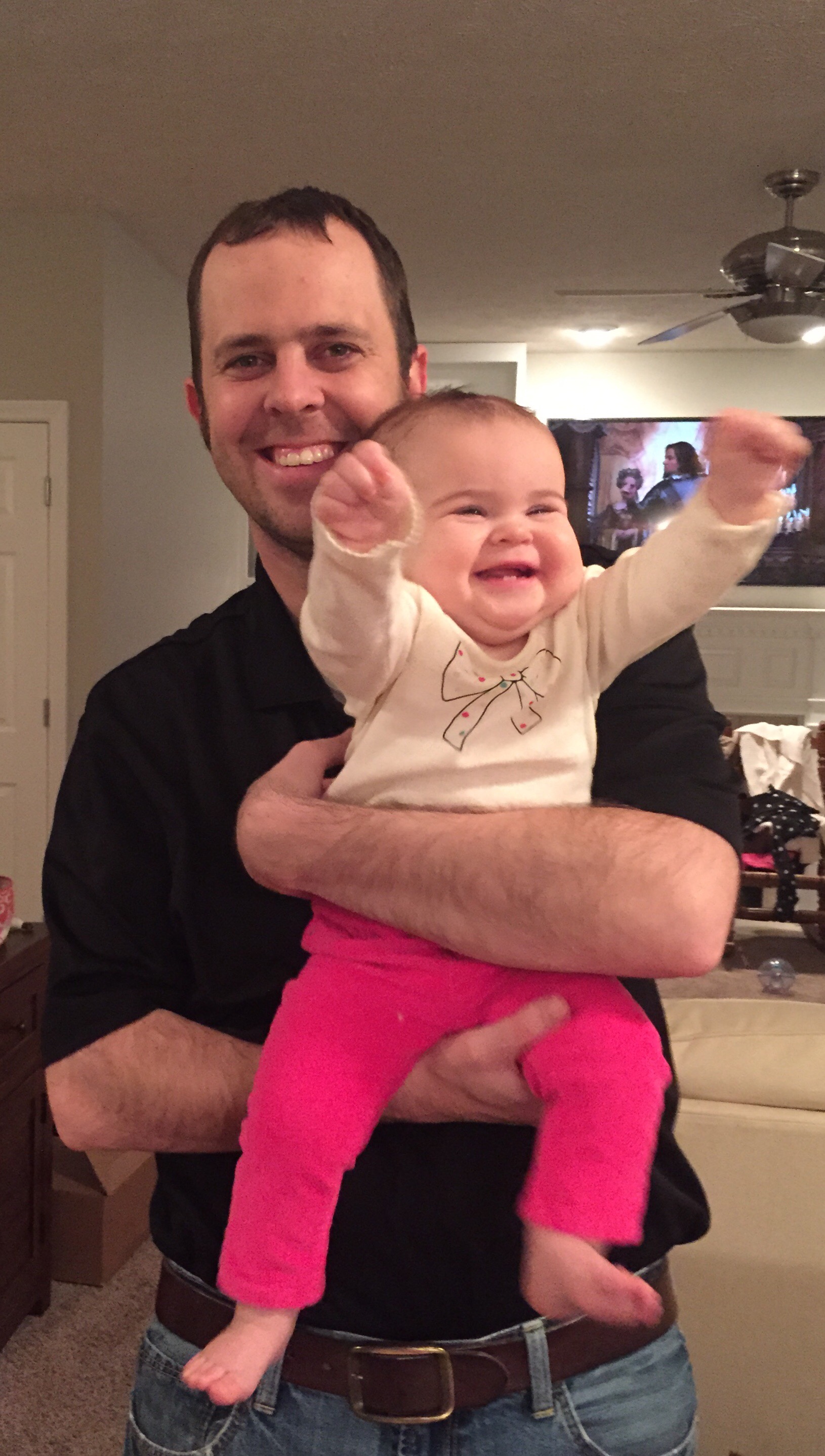 Butt naked in the living room, daddy is trying to get you to put panties on.